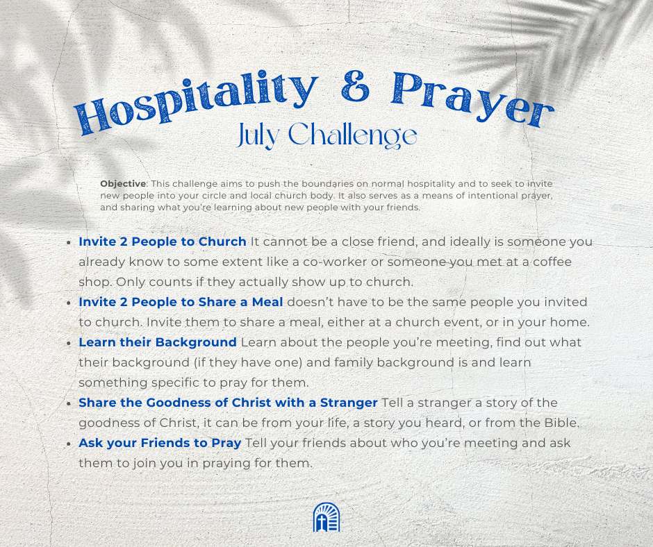 Welcome to the 2024 July Hospitality and Prayer challenge! The goal of this challenge is to push the extents of your hospitality toward strangers and invite them to your church, share a meal, and the goodness of our Lord Christ! Let brotherly love continue. Do not neglect to show hospitality to strangers, for thereby some